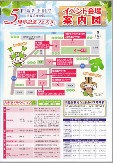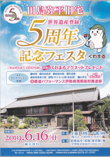 田島弥平旧宅 世界遺産登録 5周年記念フェスタ 2019.6.16(日) 2019年6月13日 manaraku 0 イベント詳細 日付: 2019年6月16日 10:00 AM – 3:00 PM カテゴリ: イベント 田島弥平旧宅 世界遺産 5周年記念フェスタ 2019年6月16日(日)10時~15時 田島弥平旧宅とその周辺で開催されます。 来場者の方には、先着順で記念品も準備しています。 イベントとして、伊勢崎清明高校書道部による書道パフォーマンス、座繰り体験も行います。 また出店関係では、ハンドメイドの店舗も多数出店し、賑やかになる予定です。 無料のお茶席もあり、いろいろなイベントで1日中楽しめます。 深谷市と伊勢崎市の境に教会がたってます。 群馬県では2番目に古い教会です。 県境のプレート 共有:クリックして Twitter で共有 (新しいウィンドウで開きます)Facebook で共有するにはクリックしてください (新しいウィンドウで開きます)クリックして印刷 (新しいウィンドウで開きます) 関連
