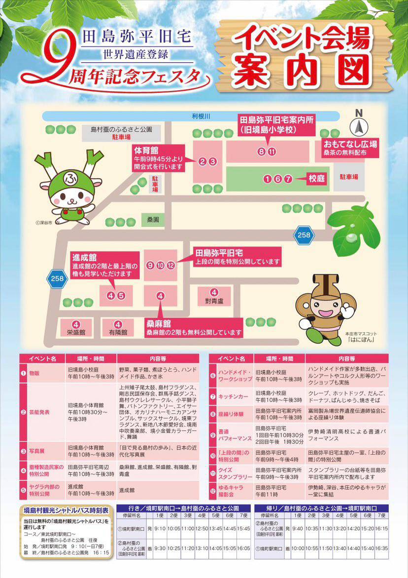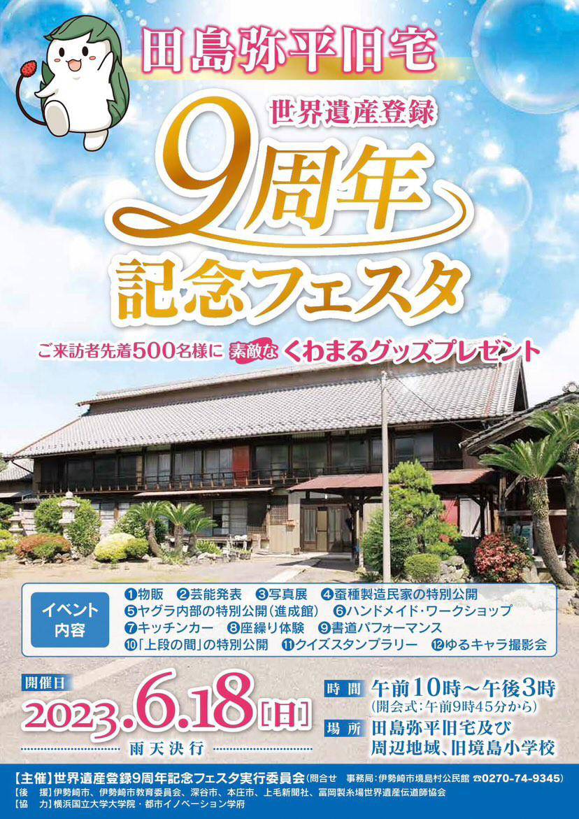 田島弥平旧宅 9周年 記念フェスタ 2023.6.18(日) 2023年5月30日 manaraku 0 イベント詳細 日付: 2023年6月18日 9:00 AM – 3:00 PM 2023年6月18日 10時~15時 田島弥平旧宅及び周辺地域、旧堺島小学校 共有:クリックして Twitter で共有 (新しいウィンドウで開きます)Facebook で共有するにはクリックしてください (新しいウィンドウで開きます)クリックして印刷 (新しいウィンドウで開きます) 関連
