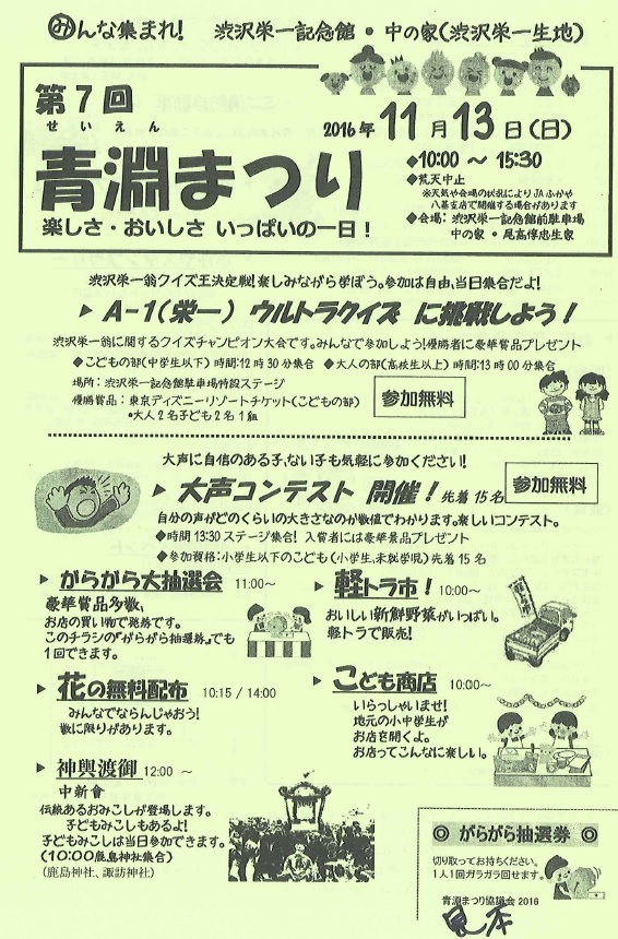 第7回 青淵まつり 2016年11月13日(日) 2016年11月7日 manaraku 0 イベント詳細 日付: 2016年11月13日 10:00 AM – 3:30 PM カテゴリ: まつり タグ: せいえん, まつり, 深谷, 青淵 第7回 青淵まつりが開催されます。 ・10時~15時30分 ・荒天中止 ※状況によりJAふかや八基支店で開催する場合あり ・会場 渋沢栄一記念館前駐車場 中の家・尾高惇忠生家 共有:クリックして Twitter で共有 (新しいウィンドウで開きます)Facebook で共有するにはクリックしてください (新しいウィンドウで開きます)クリックして印刷 (新しいウィンドウで開きます) 関連