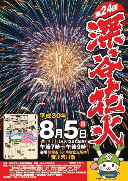 第24回 深谷花火 8月5日 2018年7月11日 manaraku 0 イベント詳細 日付: 2018年8月5日 7:00 PM – 9:00 PM タグ: はなび, ふかや 平成30年8月5日(日) 午後19時~午後21時まで 深谷市川本総合支所南「荒川河川敷」にて 第24回深谷花火が開催されます。 共有:クリックして Twitter で共有 (新しいウィンドウで開きます)Facebook で共有するにはクリックしてください (新しいウィンドウで開きます)クリックして印刷 (新しいウィンドウで開きます) 関連