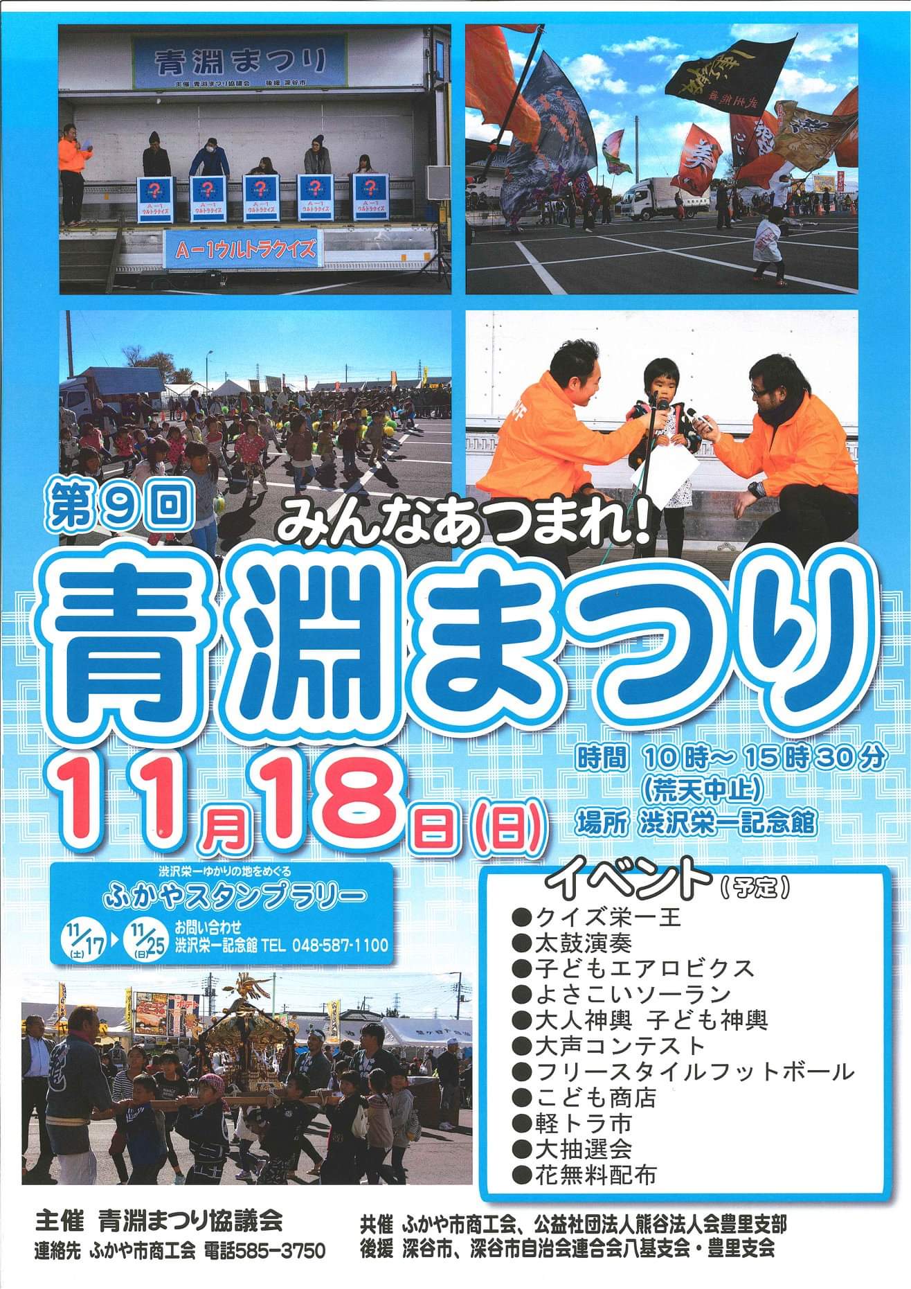 第9回 みんなあつまれ!青淵まつり 2018年11月18日(日) 2018年11月8日 manaraku 0 イベント詳細 日付: 2018年11月18日 10:00 AM – 3:30 PM カテゴリ: まつり, イベント タグ: 渋沢栄一, 青淵まつり, 2018年 2018年11月18日(日) 10時~15時30分に 「第9回 青淵まつり」が開催されます。 場所:渋沢栄一記念館 共有:クリックして Twitter で共有 (新しいウィンドウで開きます)Facebook で共有するにはクリックしてください (新しいウィンドウで開きます)クリックして印刷 (新しいウィンドウで開きます) 関連