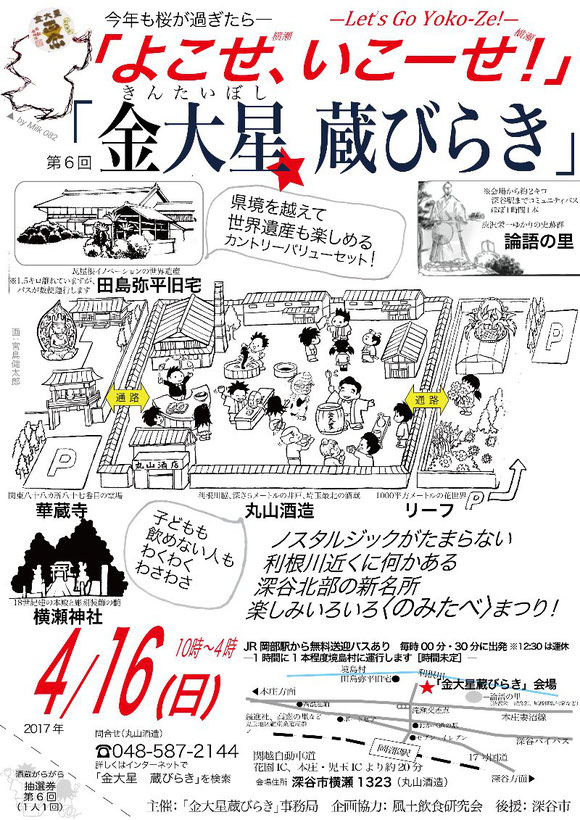 “よこぜ、いこ~ぜ!”第6回 金大星 蔵びらき 深谷 飲み食べまつり 2017年3月27日 manaraku 0 イベント詳細 日付: 2017年4月16日 10:00 AM – 4:00 PM カテゴリ: まつり, イベント タグ: よこぜ、いこーぜ, 横瀬, 蔵びらき, 金大星 ぬ”よこぜ、いこ~ぜ!”第6回 金大星 蔵びらき 深谷 飲み食べまつり 4月16日(日) 10時~16時 丸山酒造株式会社 埼玉県深谷市横瀬1323番地 去年の告知 共有:クリックして Twitter で共有 (新しいウィンドウで開きます)Facebook で共有するにはクリックしてください (新しいウィンドウで開きます)クリックして印刷 (新しいウィンドウで開きます) 関連