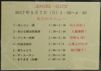 1時~4時30分まで、出入り自由、入場無料、心地良ければ投げ銭で!