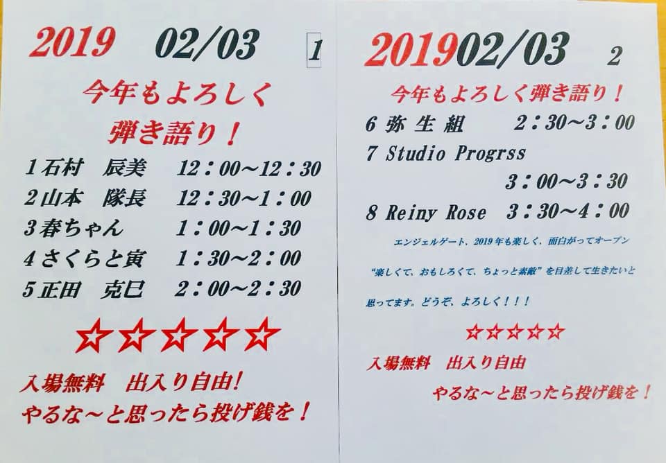 ANGEL GATE 2/3(日)12:00~ 2019年1月29日 manaraku 0 イベント詳細 日付: 2019年2月3日 12:00 PM – 4:00 PM カテゴリ: イベント, 音楽 『熱いおでんやお鍋が恋しい季節 お元気ですか? 』 ANGELGATE弾き語りライブ 2/3(日)12:00〜オープンします♪ 出演の皆さん、ファンの皆さん ありがとうございます❣️ “楽しくて、おもしろくて、ちょっと素敵✨” なステージを目指してます 『音楽で、 ほっと 暖まりに 来ませんか? お待ちしてます♪(๑ᴖ◡ᴖ๑)♪ 』 共有:クリックして Twitter で共有 (新しいウィンドウで開きます)Facebook で共有するにはクリックしてください (新しいウィンドウで開きます)クリックして印刷 (新しいウィンドウで開きます) 関連