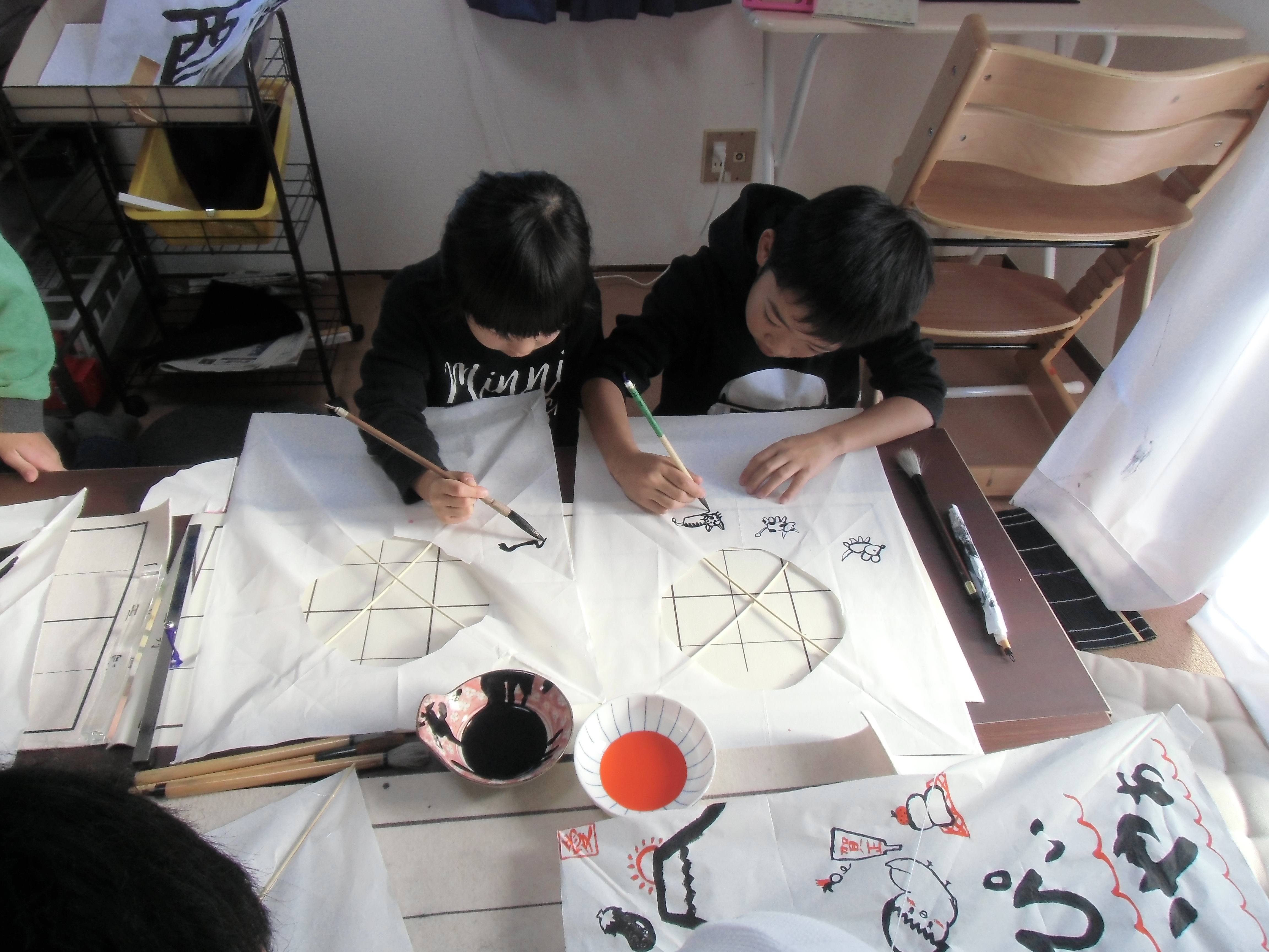また、夏・冬には創造力を養うワークショップを行います。過去には、夏に手作りうちわ作り、冬に手作り凧作りを行いました。どちらも日ごろの学習を応用しつつ、みんな楽しく取り組みました。